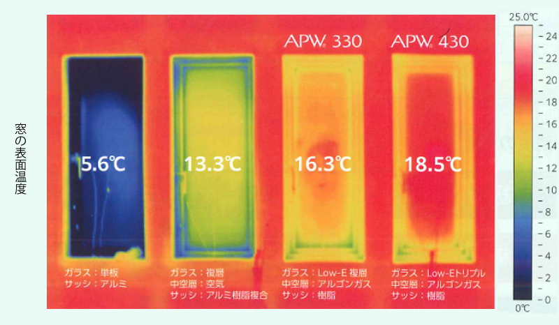 上の写真は、同じ室温でも窓の性能によって室内温度がこれほど変わることを示しています。