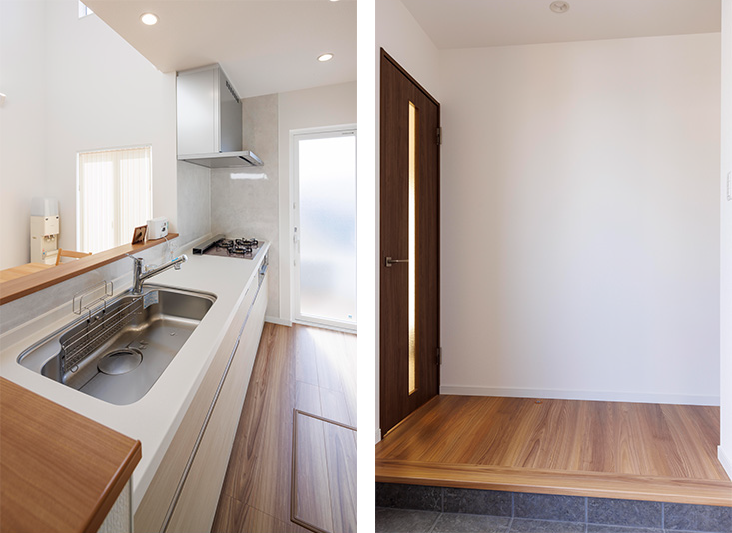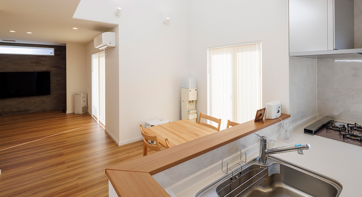 奥様は現在育休中ですが、近い将来、仕事に復帰する予定。そのため、家事や育児を時短できる生活動線を意識した間取りを希望されました。家事の中心となるキッチンやサニタリーゾーンを近くにまとめ、細切れな家事を効率的にまとめてこなせる工夫が取られています。