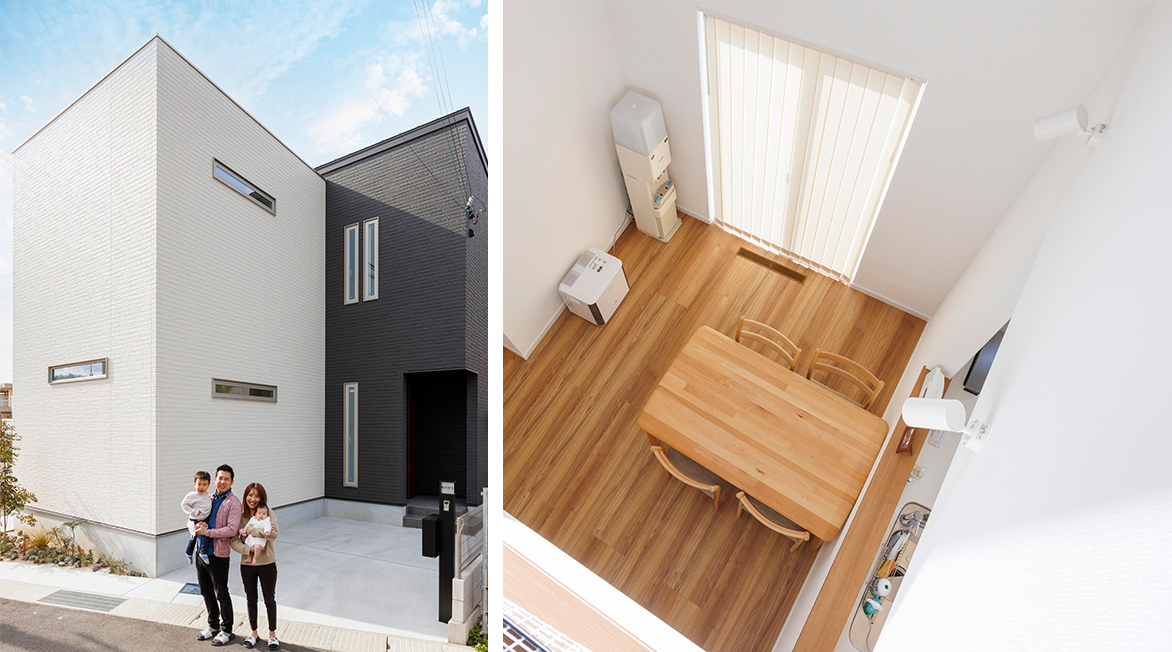 幹線道路近くで交通至便でありながら、閑静な環境も整う理想的な立地。数軒の住宅が立ち並ぶ中、M様邸の黒と白のツートンカラーの外観はひときわ目を引きます。M様家はご主人と奥様、2歳の長男と3カ月の長女の4人家族。「子どもが小さいうちに一軒家を建てよう」と、昨年秋にマイホームを完成させました。