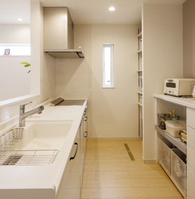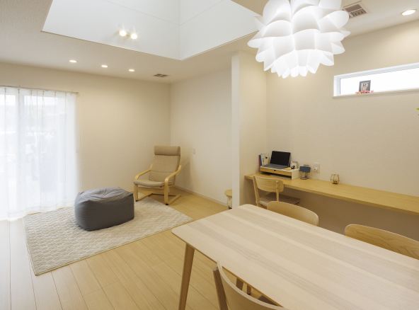 お二人のこだわりは間取りやデザインにも反映。暮らしの中心となるLDKは「効率的で無駄のない空間設計を」と希望され、生活動線を確保した暮らしやすいレイアウトが取られています。内装は奥様が大好きな色であるホワイトを基調。吹き抜けから注ぐ陽光で、明るく広々としたリビングが実現しました。