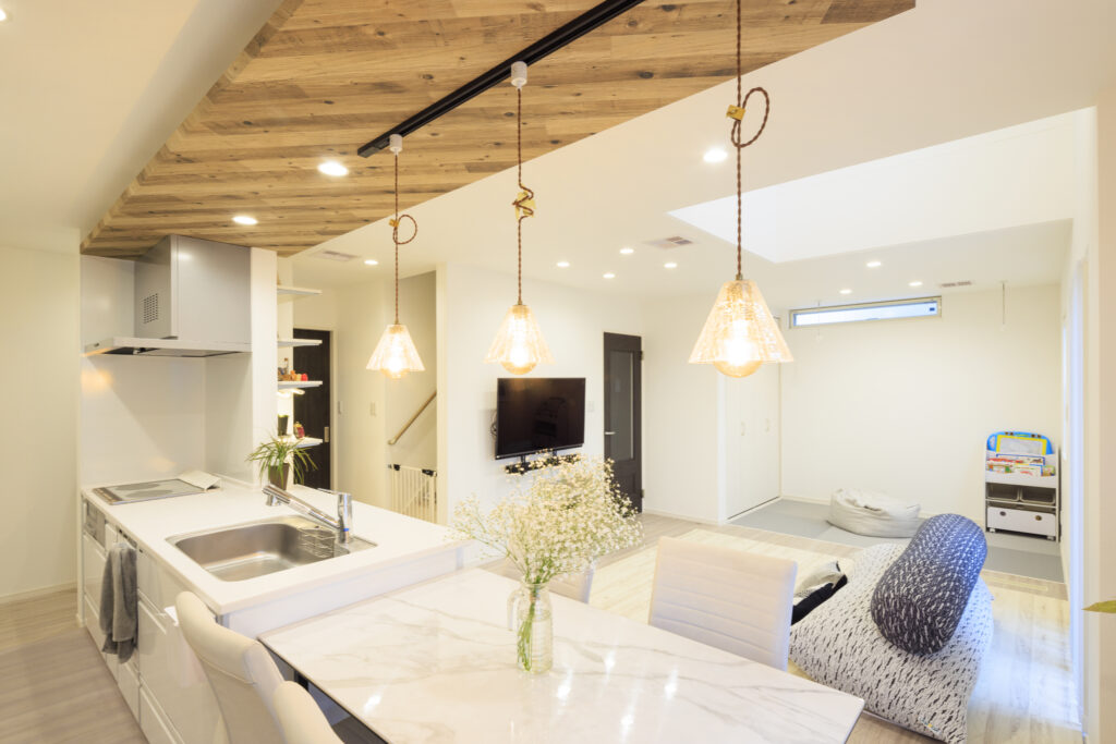 ご主人:キッチンカウンターは下がり天井にして、ペンダントライトやダウンライトなどの照明にも凝りました。
