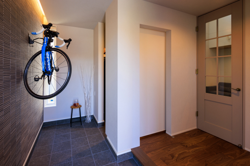 小1の娘さんと3人暮らしのため、玄関、ランドリールーム、キッチン、リビングと、1階をぐるりと一周できる回遊タイプにし、家事や育児がスムーズにこなせる生活動線や家事動線にこだわりました。「ランドリールームには洗濯物を干すスペースやクローゼットもあります。帰宅したら玄関からランドリールームに直行して、汚れた衣類を脱いで着替えられて便利ですよ」と奥様も満足そうです。