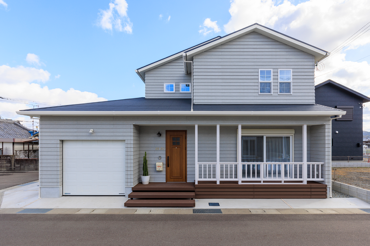 M様ご家族が暮らすアーリーアメリカンスタイルの家。板を重ね張りしたラップサイディングや玄関前のカバードポーチが特徴で、住宅街でもひときわ目を引きます。「通りすがりの人に、『素敵なおうちですね』と声を掛けられたこともあるんですよ」との奥様の言葉のように、海外の映画やドラマでよく見る外装デザインを実際に目にすると、「こんな家に住んでみたい」と胸が高まります。