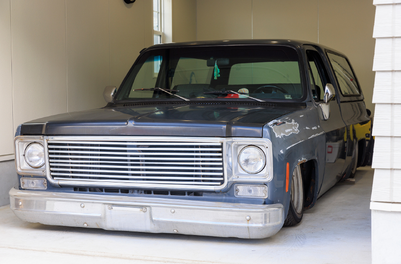 アメリカンハウスにふさわしく、インナーガレージも設置。「家を建てる前は、住まいから離れた場所に車を預けていたので、インナーガレージは新居の絶対条件でした」とご主人は話します。自慢の愛車は76年製造の古き良きアメ車で、そのクラシカルなスタイルと角張ってパワフルなボディーが魅力的。愛車が家にしっくりなじんでいる理由を聞くと、家全体の設計やデザインも、「車とインナーガレージありきの家づくりを」と設計士にお願いしたそうです。
