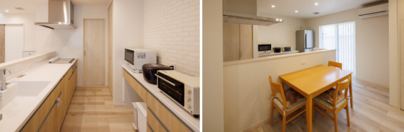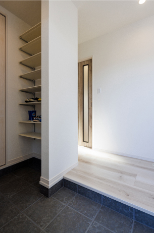 玄関わきにはウオークスルーのファミリークローゼットを設置。コートなどのアウターやシューズ、お子さまの遊び道具や自転車が整然と並べられ、玄関回りがすっきりと片付いています。クローゼットの奥には扉があり、開けるとランドリールームにつながります。「外出先で汚れた服がすぐに洗えます。物干し場や衣類の収納スペースもあるので、“洗う・干す・しまう”がここで完結できます」と奥様。また、ランドリー室の先には、バストイレやキッチン、リビング、そして玄関と動線が続き、家の中をぐるりと一周。「回遊型の間取りは生活動線や家事動線が短く便利で、気に入っています」と満足そう。