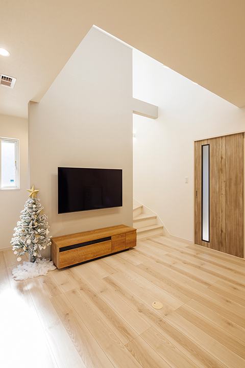 三幸建設の家は全館空調マッハシステムが標準装備です。「全館空調について聞いたことはあったけれど、知識はまったくなかった」とご主人は話しますが、今ではその快適な住環境に満足しているそう。「家中の温度が一定していて、冬でも廊下が寒くない。家のどこにいても暖かいので、上着を忘れて外に出たこともありました」と笑って話します。奥様も「息子は基本裸足。冬でも薄めの寝具で寝ていますよ。お風呂上がりも寒くないから、風邪をひきにくいかも」と、リアルな声を伝えてくれます。