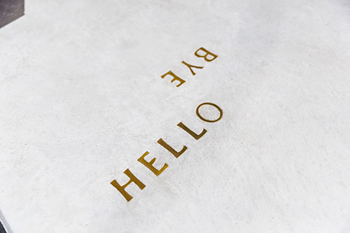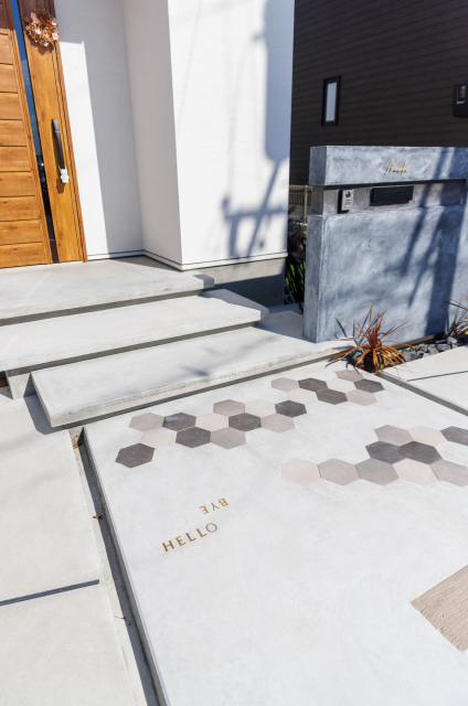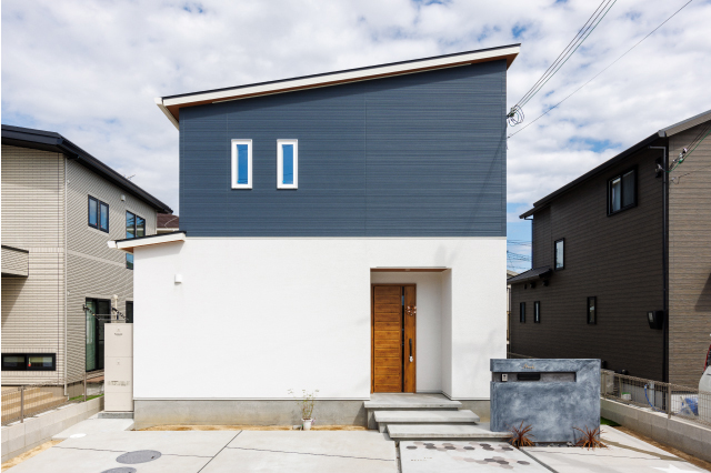青と白のツートンカラーの外壁と木製玄関ドアの組み合わせが印象的なM様邸。外壁と色調を合わせたスタイリッシュな門柱や、タイルや枕木、真鍮レターを埋め込んだアプローチも目を引きます。