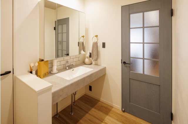 デザインのみならず、間取りにもこだわりを見せるM様邸。LDKを中心に、脱衣室や浴室などの水回り、玄関をスムーズにつなぐ回遊型の動線は、仕事や育児で忙しく、効率よく家事を済ませたいという、奥様の要望を反映。脱衣室は室内干しができ、こちらも家事の時短に貢献しています。