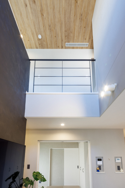 収納家具やフローリングのブラウンカラーとの相性もよく、吹き抜けからは陽光が注ぎ、家族でくつろぎのおうち時間を過ごされています