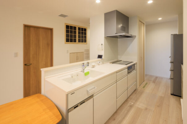 生活動線は玄関、リビング、キッチン、バス・洗面所、トイレと、家の中をぐるっと巡る回遊型。専業主婦の奥様の家事負担が少なくなるように、水回りがまとめられたレイアウトになっています。また、「キッチン横にダイニングテーブルを置くスペースを取って、配膳を効率よく」「家族が気兼ねなく使えるように、洗面所と脱衣室を別々に」など、奥様のアイデアが家の随所で実現されています。