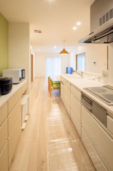 生活動線は玄関、リビング、キッチン、バス・洗面所、トイレと、家の中をぐるっと巡る回遊型。専業主婦の奥様の家事負担が少なくなるように、水回りがまとめられたレイアウトになっています。また、「キッチン横にダイニングテーブルを置くスペースを取って、配膳を効率よく」「家族が気兼ねなく使えるように、洗面所と脱衣室を別々に」など、奥様のアイデアが家の随所で実現されています。